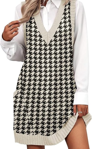 For a playful twist on the vest-dress trend, this patterned version is perfect. Its bold design makes it a standout fall piece, and it looks great styled over a fitted long-sleeve top. Add tights and ankle boots for the ultimate cozy-chic fall look.